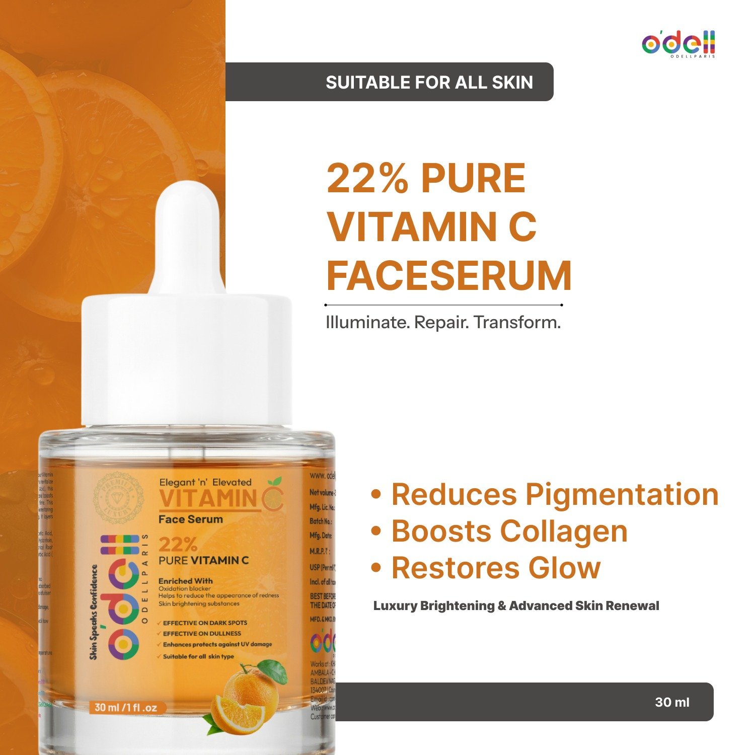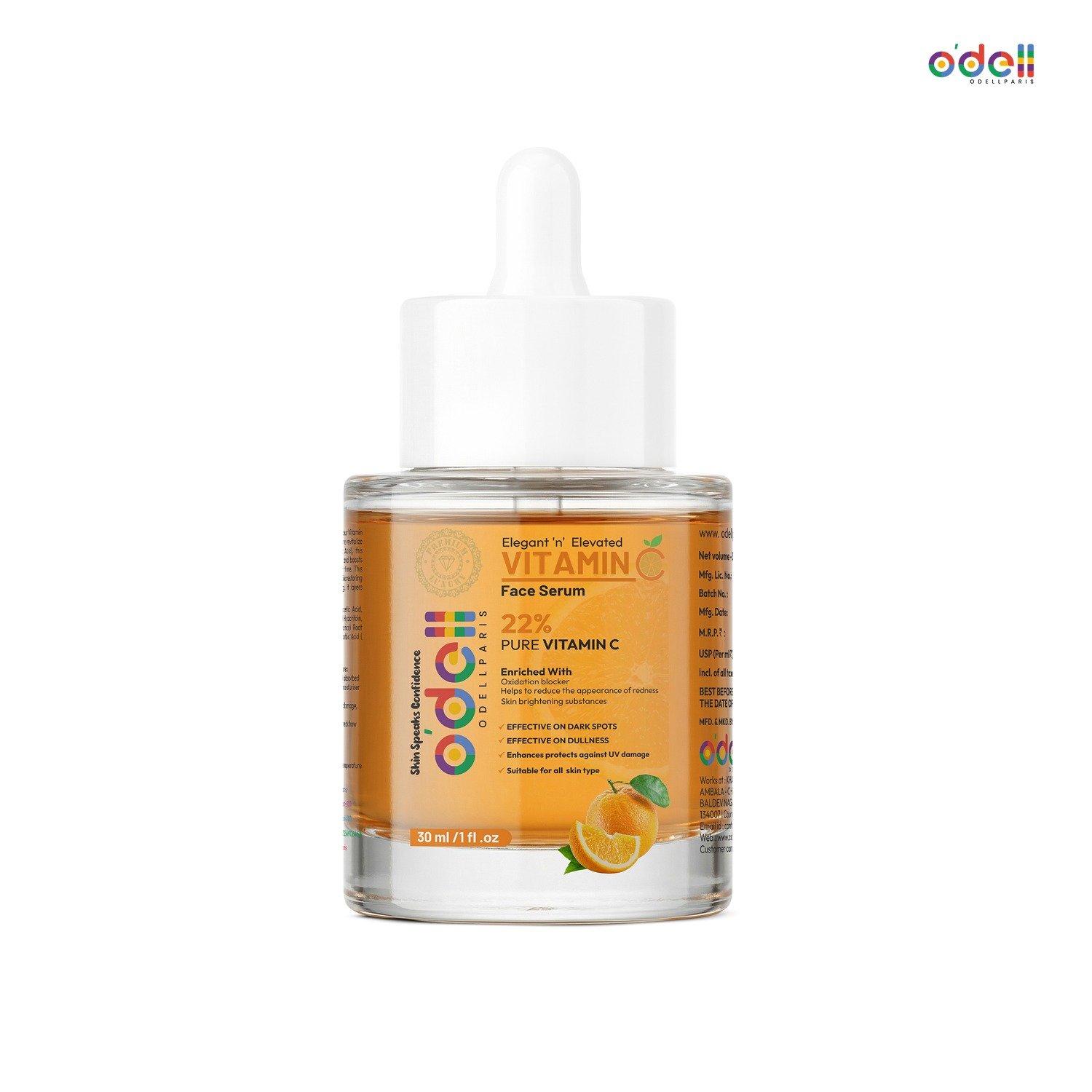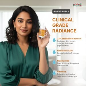 Experience the power of clinical-grade radiance with Odell Paris 22% Pure Vitamin C Serum — an advanced brightening and age-defying formula crafted for visibly clearer, firmer, and luminous skin. Infused with high-potency stabilized Vitamin C, this premium serum targets pigmentation, dullness, uneven skin tone, and early signs of ageing while boosting collagen production and protecting your skin from environmental stress.